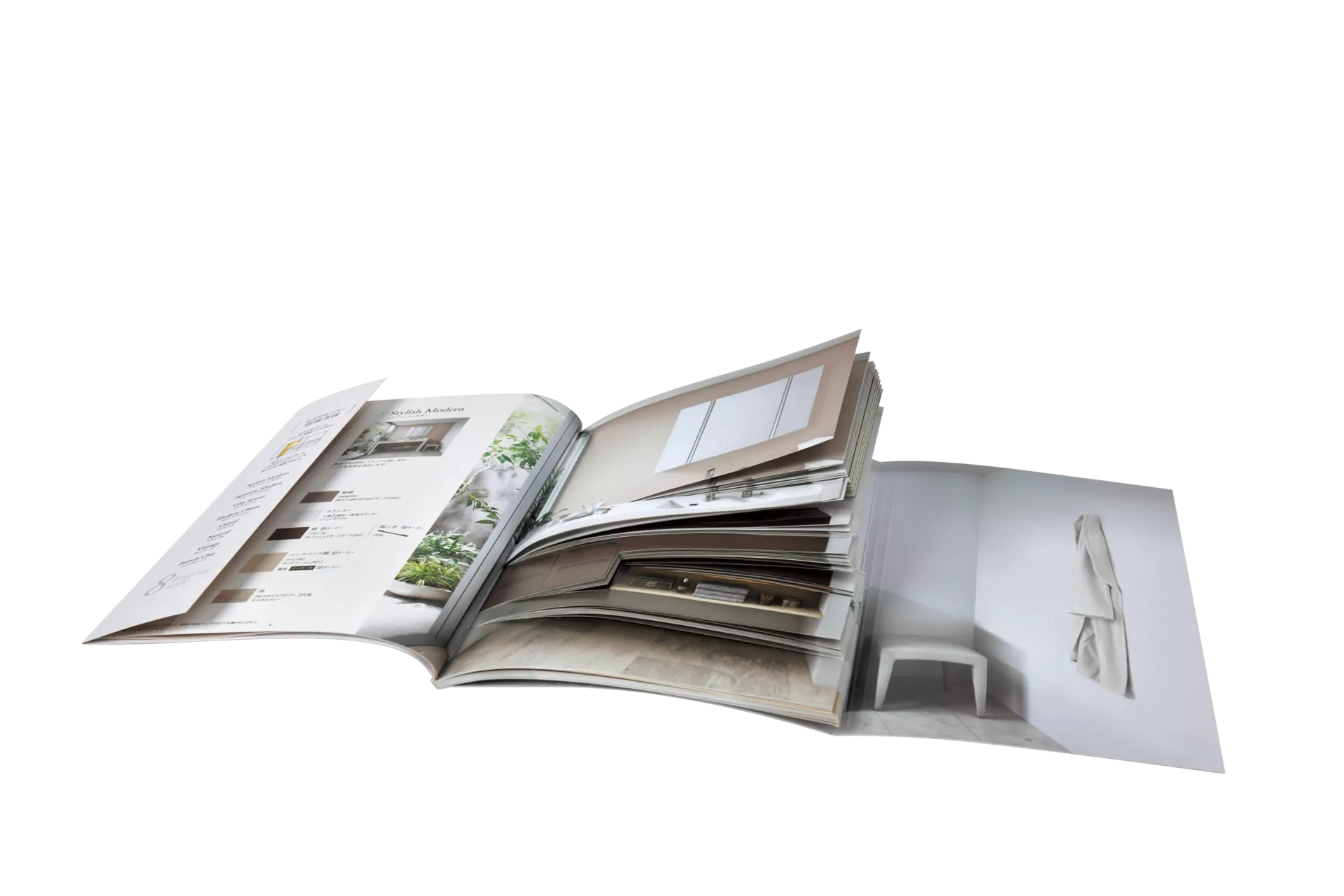 ページの一部を折り込む特殊設計で、ページをめくるだけで簡単にカラーコーディネートを体験可能。お客様が選ぶ楽しさを直感的に味わえる仕掛けを開発しました。