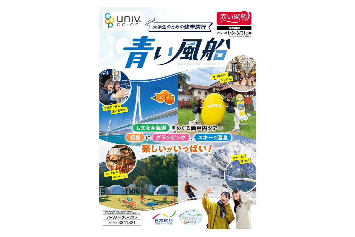 大学生向け旅行ブランド「青い風船」の修学旅行パンフレット制作を担当しました。雑誌風のレイアウトと豊富な写真で、学生が友達と一緒に行きたくなる楽しさやワクワク感を直感的に伝えるデザインにまとめています。
